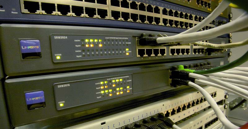 There may be multiple gigabit switches, but you can start with one large 24-port gigabit switch. The switch will be your backbone of the network to connect all the computers, servers, and peripherals together. You can organize your network in to various groups topologies for added security. For example, you can segregate parts of your network from other parts with VLANs.